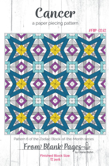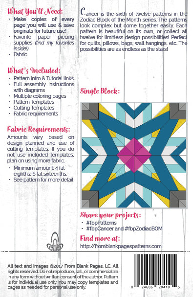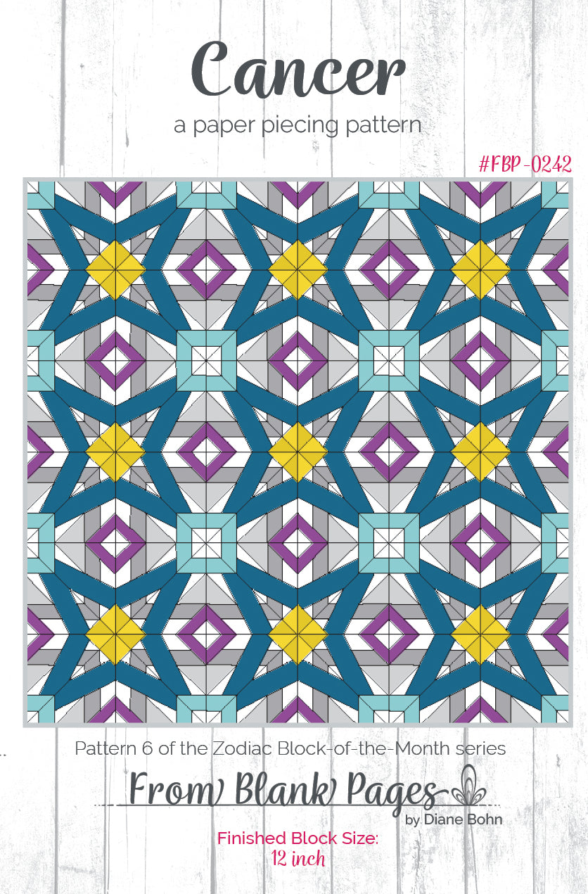 Cancer is the sixth block of the Zodiac Block of the Month pattern series. A paper piecing block with a geometric punch! Use the coloring pages to help you plan the perfect design! Use the block alone, on repeat, or mix and match with other Zodiac blocks for unique project you can call your own!